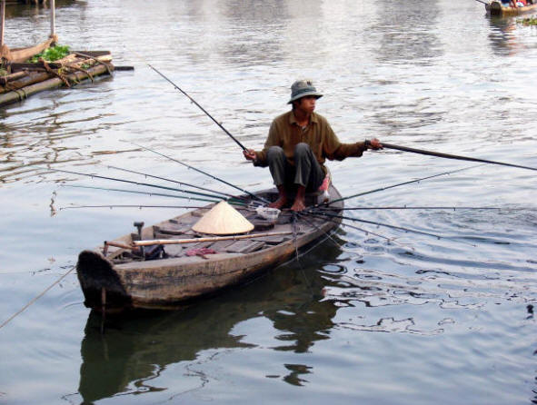 On a trip down the river we stopped at a rural Islamic Cham village. Two young women were weaving silk on looms, so exquisite and soft that it melted in your hands. We encouraged their artistic ability by purchasing several bright, luxurious scarves, and after tasting snacks from the nearby little waifs we were back on the river. Fifteen percent of Vietnam’s seafood production is done on floating fish farms where they raise mainly asiatic catfish. Each floating house contains a large pen underneath. As we rode down the river the smell of cooking fish food paste, in large vats, wafted through the air. Once again the poorest fish farmers produce the best quality fish because all the expensive commercial fish food contains hormones and antibiotics, which are of course transferred to the humans who consume them. As a reward to these poor hard working fellows the Japanese will now pay top dollar for the purer chemical free fish to be flown to them. A hilarious sight were the fishermen, in small dugout canoes next to the back of the floating fish tanks, catching the unwary buddies coming to visit the enclosed fish. One young entrepreneur had14 rods, like the spines of a sea urchin, sticking out of his tiny wooden canoe. Persistence is the key to success!!