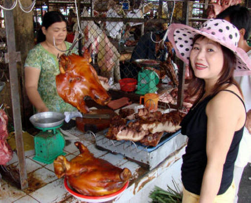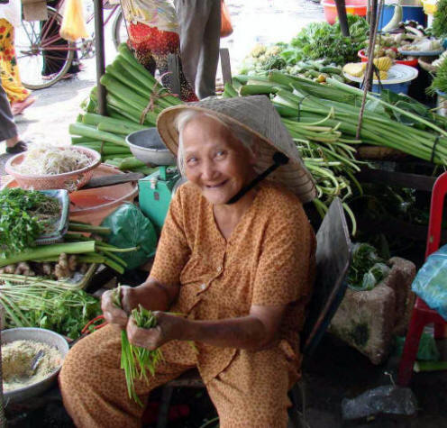 Arriving after dark Joseph had to search high and low for a room. We ended up at a hotel that was at its prime in 1925. The chubby wife of the owner was a wonderful rough cut gem who continually squeezed my hand and kissed my arm in excitement; thrilled beyond words to have foreigners in her establishment. She even offered us toilet paper twice daily, just to buy entrance into our room. Pantomiming, along with a few Vietnamese words, I asked if I could cook in her kitchen. She was eager to help and loudly smacked her lips in approval as she sampled our meal. Unfortunately it was apparent that she herself rarely cooked anymore, instead eating take away or sweets from the surrounding vendors. Her health was starting to suffer, but luckily not her sense of humor. We had many chuckles together and it was her good nature, plus an excellent buddha food stall in the market that prompted us to stay an extra day.