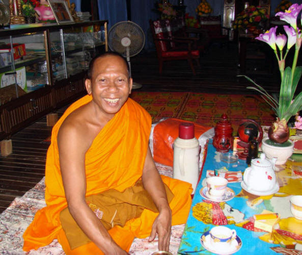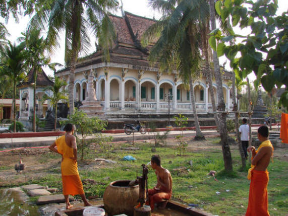 When walking back from the Ong Met Khmer Pagoda, where we were served tea and sweet oranges right off the alter, we heard a distant, “Hello, Hello!” as a woman chased us down and invited us into her humble home. Her 70 year old husband served us fresh coconuts from the tree in their yard as she spun her tale of life. The husband, having been a worker with the previous government, was interred for four years of ‘reprogramming’ after the war. Sixty year old Wa, having worked with the Americans during the war, was held for 3 years of ‘retraining’ and labor. They fell in love in jail and were married when they were released. Last year she saw an ad in the newspaper offering relocation to the USA for people who had worked with the Americans for 5 years or more. Now her whole energy is focused on the successful outcome of that application and the starting of a new life where the grass is, in her eyes, much greener. After a pleasant visit we started carefully telling her that life in America was good but can be very fast paced and expensive. She couldn’t grasp what we were saying, as she refused to let anything tarnish her glowing ideal of a shiny America. We, of course, didn’t even broach the subject of politics. Then all of a sudden she said, “It’s time to go.” and away we went – wishing her the best of luck in her new life! During our hot and sometimes dusty walk I had secretly wished for some of the juicy oranges they sell at the market and for a refreshing coconut. They had materialized within the hour. You have to watch what you wish for.