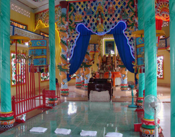 With a ‘Disney Fantasia’ feel to it, the colors in this new Cao Dai Temple cheered you up the minute you stepped foot in it. Note the statues of all the great prophets of the world and the all seeing eye above the alter.