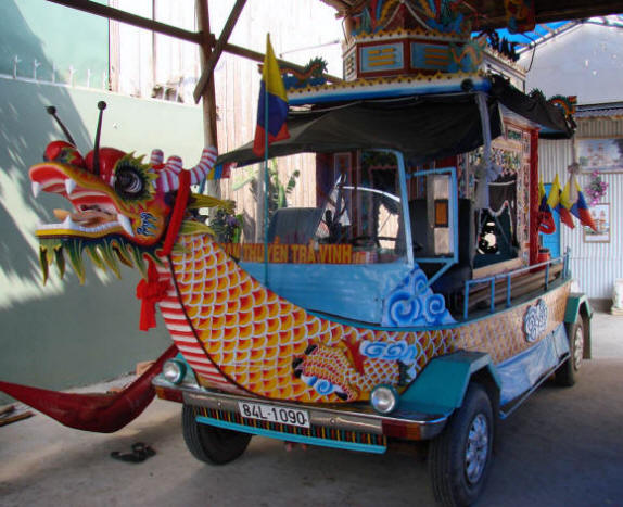 A Vietnamese hearse gives you a send off in style. It is usually followed by family and friends dressed in white, riding in trucks or buses, complete with drums and music.
