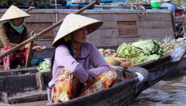 Dhanya, an ancient Indian word for rice, translates as the sustainer of the human race. A Vietnamese fable tells of olden days when rice didn’t need to be grown. It could be summoned, in the form of a large ball, simply by prayer. One day a man ordered his wife to sweep the floor in preparation for the daily arrival of the rice. She was still sweeping as the white ball appeared and struck it, shattering it to pieces. Since then, the Vietnamese have had to work hard to produce rice by hand. And they do work hard, as seen in mile after mile of rice fields covering the Delta. Women in conical hats, ‘non bai tho’, irrigate the shimmering green fields by hand, as nearby farmers plant new starts or plow with water buffalos. Not much has changed for centuries, except that with a push from the government, exportation of the world famous rice has risen to 3.5 million tons annually. Along with that has come heavy chemical spraying, of course, adding toxic runoff into the waterways. Our very nationalistic young guide from Saigon proudly proclaimed that within 10 years they expect the city limits of Saigon to include the whole of the Mekong Delta. Already a surprising population density in the Delta, where exactly will they grow the rice once all these people and buildings arrive?