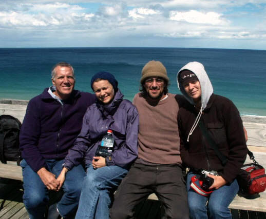 Enjoying the view, with daughter Mariah & boyfriend Shane, overlooking the penguin rookery. Behind us – Antarctica. We added even more layers to observe the penguins that night!